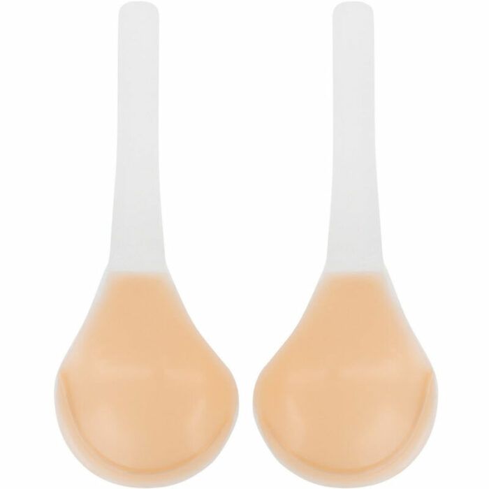 Despeja tu piel de cualquier aceite y crema. Una vez hecho esto, seque la piel con una toalla. Retire la película protectora de la copa y de la correa transparente. Voltea la copa hacia afuera mientras sostiene la cinta transparente por su extremo con una mano. Coloque la taza en el ángulo de pecho deseado y presione suavemente los bordes de la taza con las yemas de los dedos. A continuación, tire de la correa transparente en dirección ascendente sobre el hombro. Cuando se logre la posición deseada, pegue la correa a la piel. Repita el mismo procedimiento con la otra mama. Presione ambas tazas firmemente sobre los senos para obtener un efecto adhesivo óptimo.
