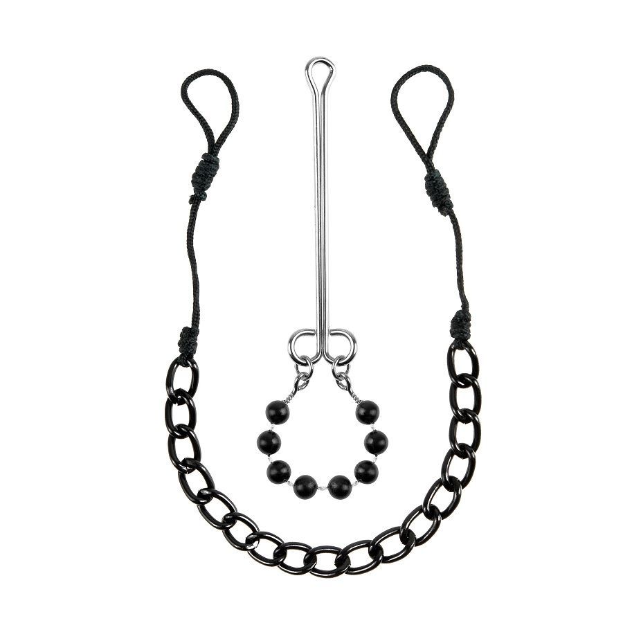 Corre la abrazadera de metal para colocar su clítoris a través de la lágrima, ofreciendo una fácil colocación a su más preciado punto de placer, !mientras que las perlas que cuelgan cosquillean los labios vaiginales!
