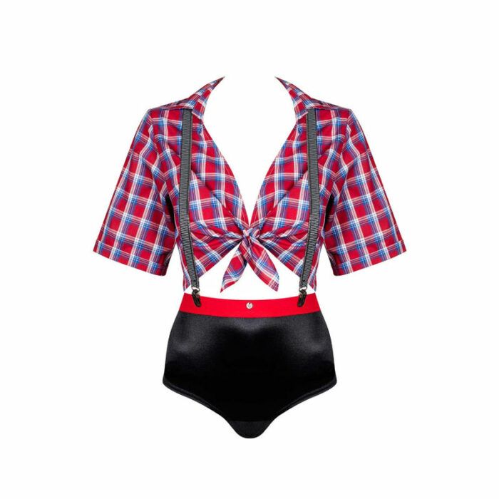 - Un hermoso disfraz que consiste en una camisa a cuadros y panties