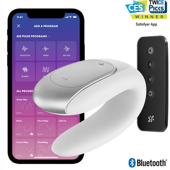 También cuenta con un control intuitivo: Los diferentes programas de vibración se pueden controlar mediante los botones de control del propio vibrador para parejas, con el control remoto inalámbrico incluido o a través de la aplicación Satisfyer Connect. A través de la aplicación podrás descubrir todavía más posibilidades de mejorar el juego sexual: Tienes la posibilidad, entre otras cosas, de crear tus propios programas de vibración, asumir el control del Satisfyer de tu pareja o conectar la cuenta a Spotify: ¡hay tanto por descubrir! La aplicación es gratuita y está disponible para Android, iOS y Apple Watch.